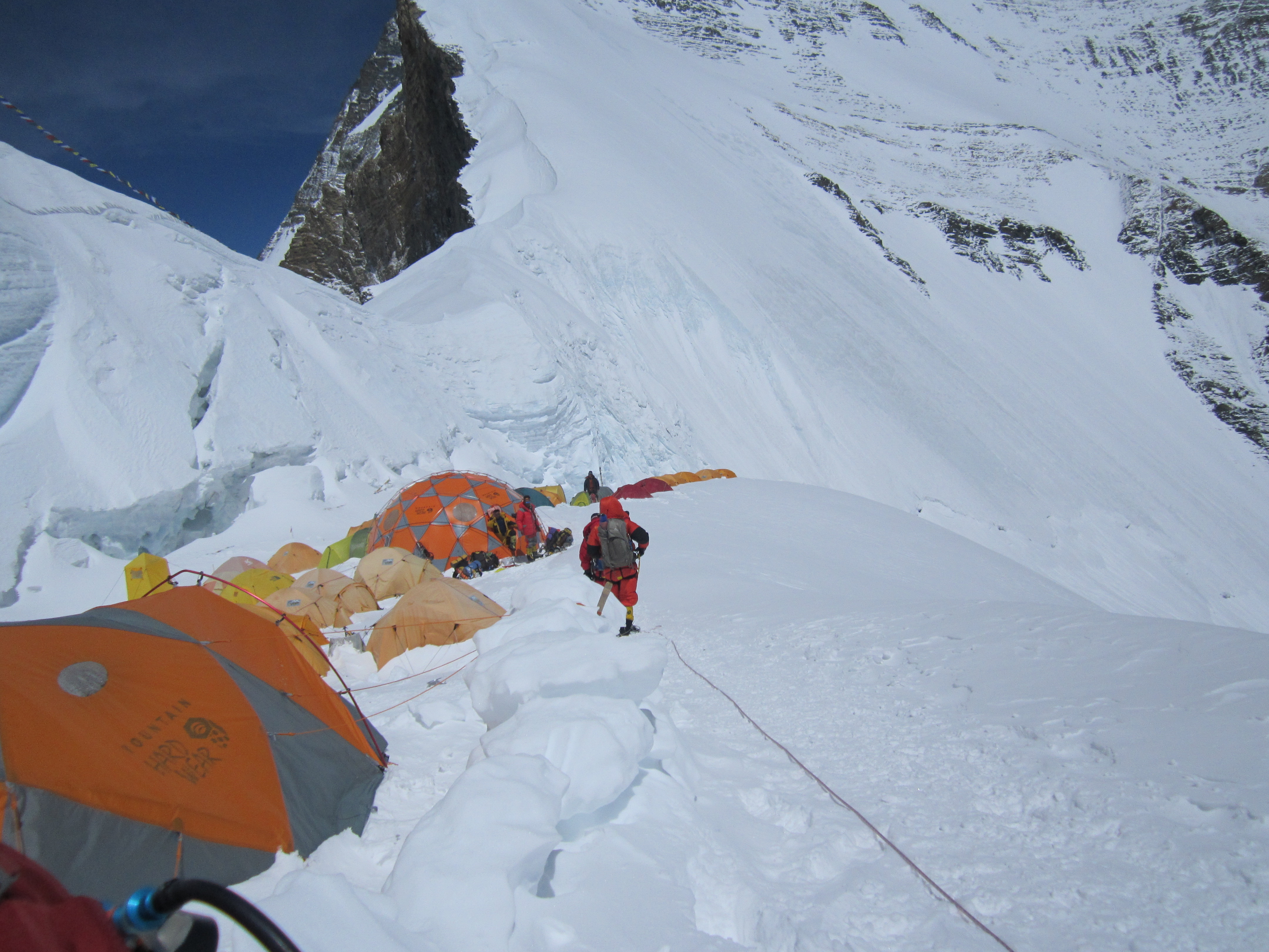 During high-altitude mountaineering expeditions several high camps are typically established between base camp and the summit. Tents are erected and some gear stored in those camps in preparation for the summit push. This way climbers don’t have to waste time and energy when the weather window is forecast to open. On summit day, which is when you climb from your highest camp to the summit and as far back down the mountain as you can, on ascent you only have the bare necessities in your backpack: water, a snack, a few essential spares, a camera, a walkie-talkie, oxygen bottle(s) if you’re using the gas, etc. You want to travel as light as possible on the way up, but you will have to collect all of your gear and carry it with you on descent through the lower camps.
